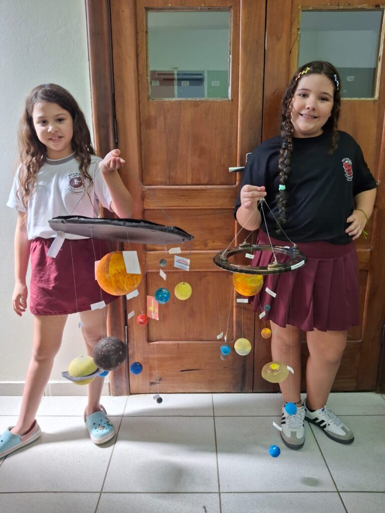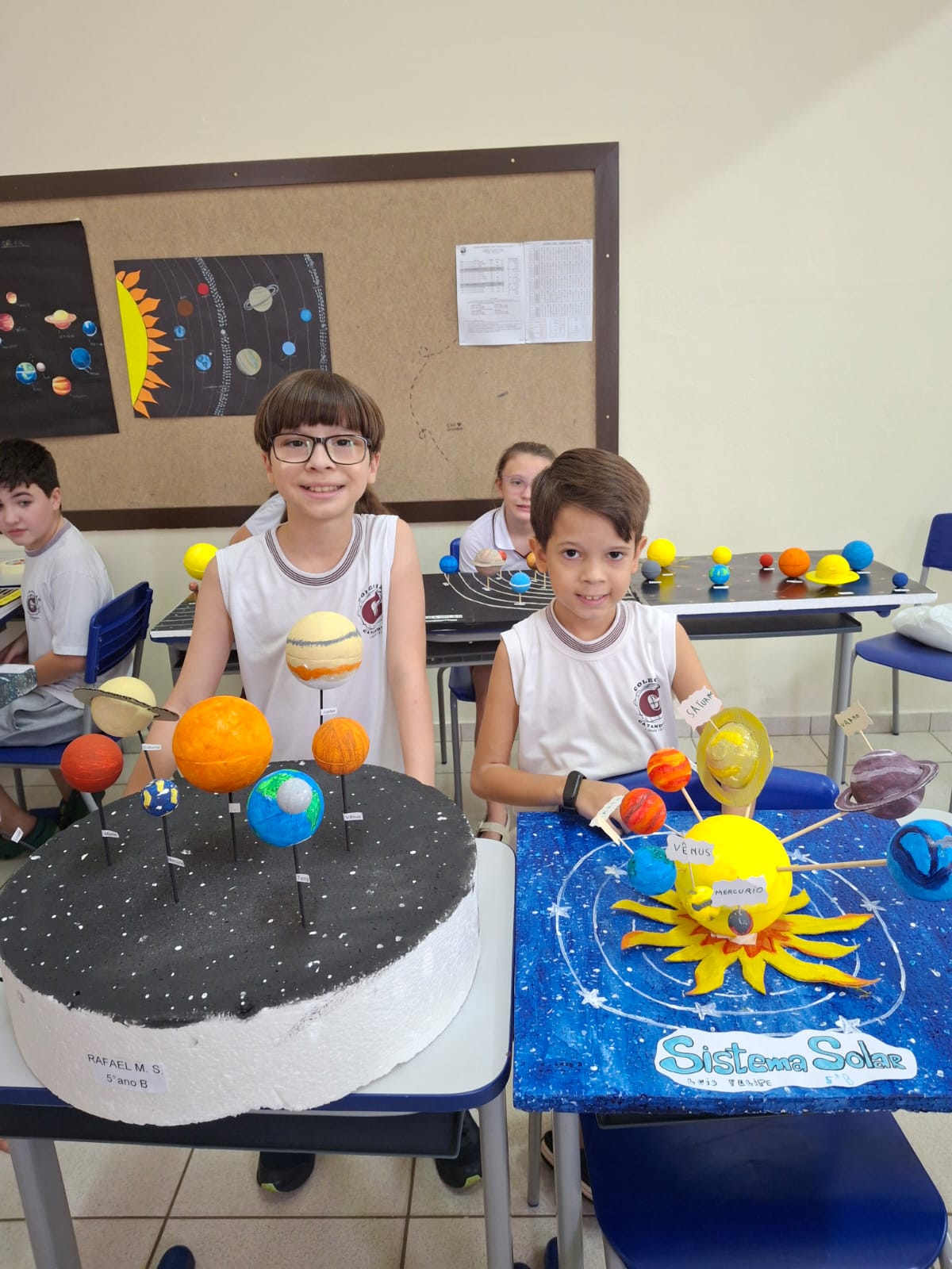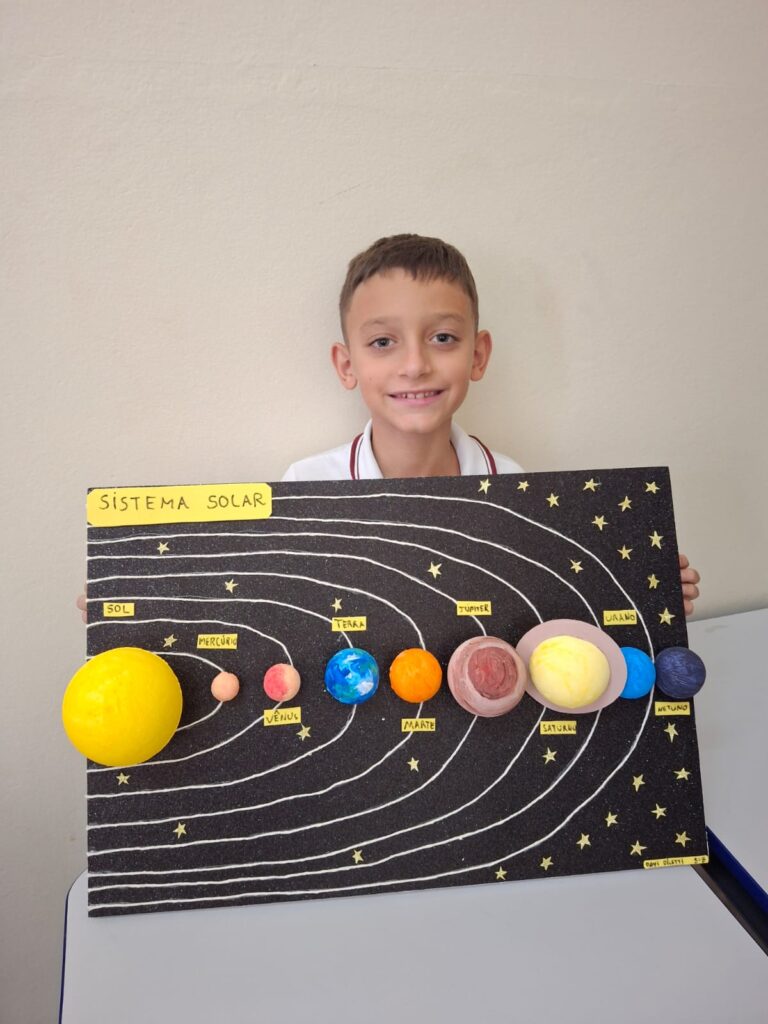 Os alunos do 5º ano B desenvolveram um trabalho de ciências sobre o Sistema Solar, com o objetivo de compreender sua organização, identificando o Sol, os planetas e suas principais características. Construíram maquetes ou cartazes representativos e, posteriormente, realizaram a apresentação para os colegas, explicando as informações pesquisadas. A atividade favoreceu a aprendizagem significativa, a criatividade e a oralidade.