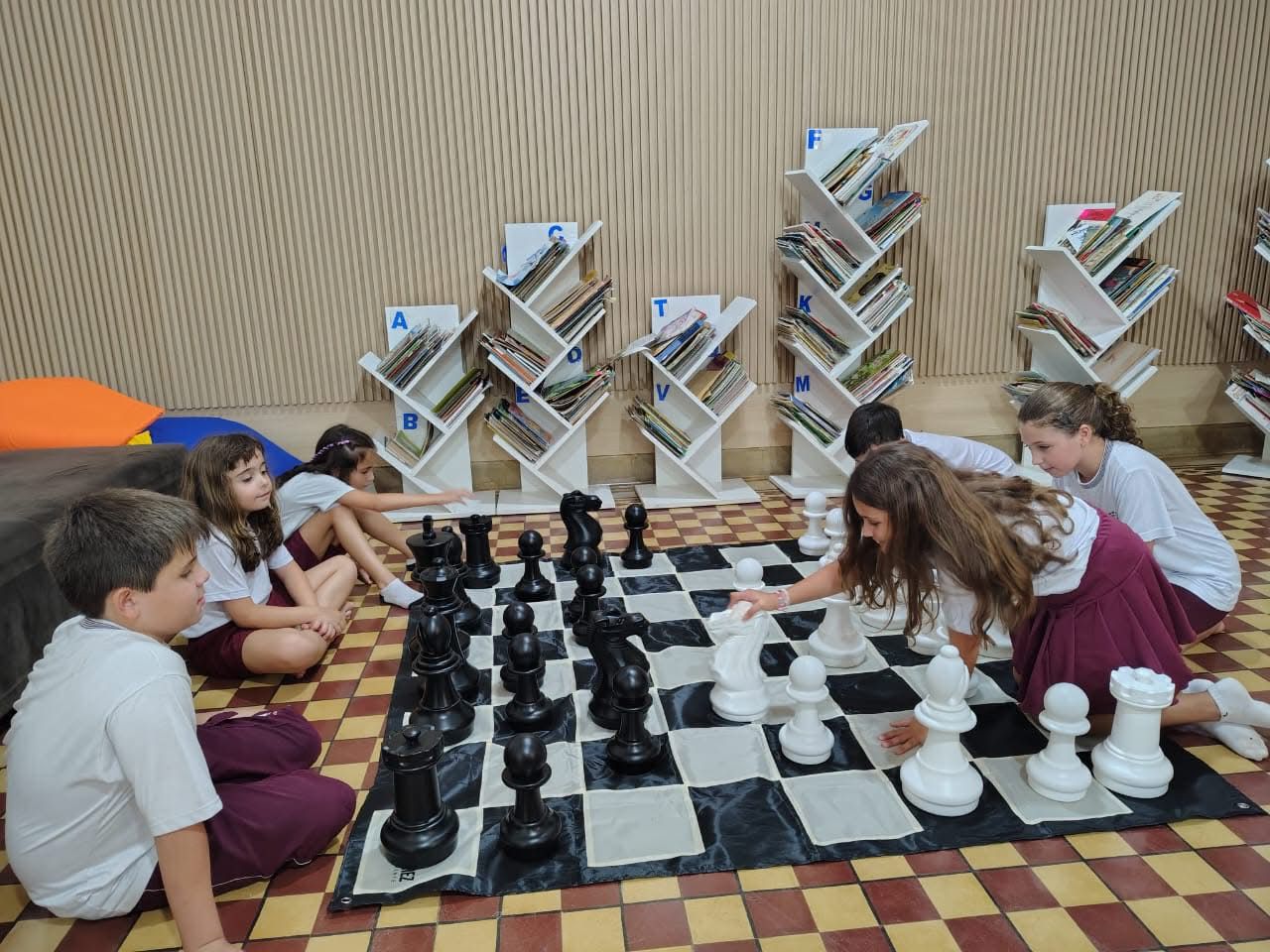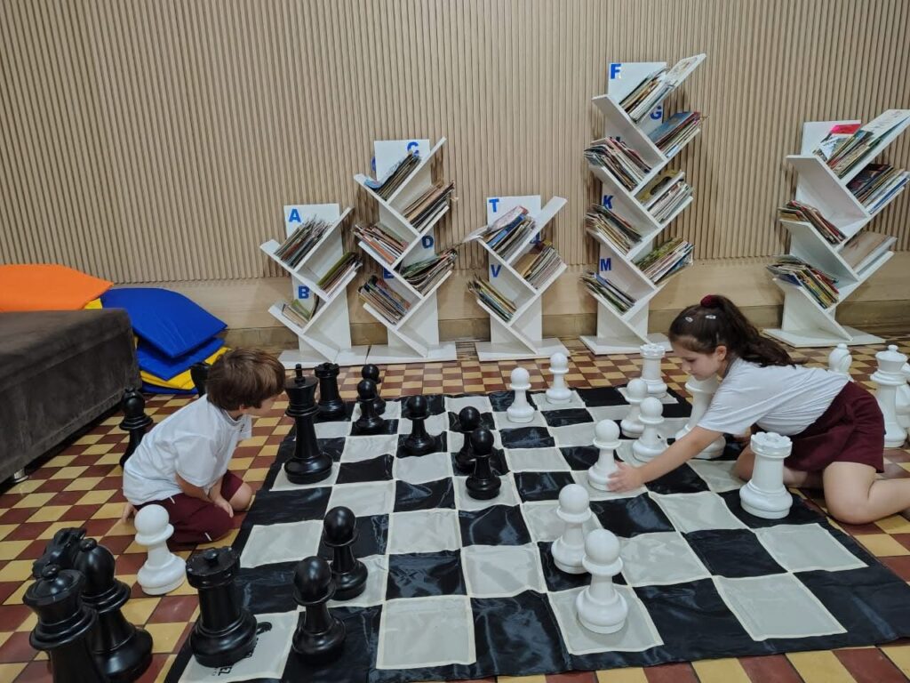 O Xadrez Gigante está disponível para uso na biblioteca do Colégio, incentivando o raciocínio, a concentração e a tomada de decisões de maneira lúdica.